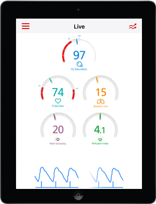 Con il modello dotato di Bluetooth® LE, è possibile visualizzare e condividere i dati dei parametri, inclusi trend e la forma d'onda pletismografica, tramite l'app Masimo SafetyNet®† su un dispositivo smart compatibile.